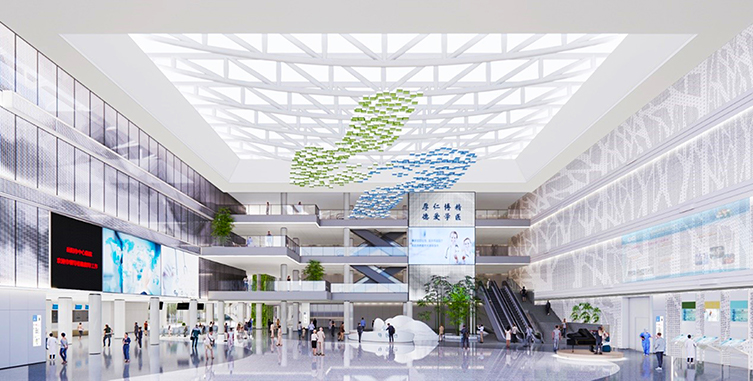 岳陽(yáng)市中心醫(yī)院門(mén)診大廳由岳陽(yáng)市城市建設(shè)工程有限公司承擔(dān)建設(shè),由7榀高強(qiáng)性能混凝土(UHPC)魚(yú)腹型桁架結(jié)構(gòu)與玻璃幕墻組合而成,單榀桁架長(zhǎng)40.81米,桁架構(gòu)件高3.1米,構(gòu)件厚度0.25米。屋架采光頂總面積約1300平方米,總重量超過(guò)400噸。