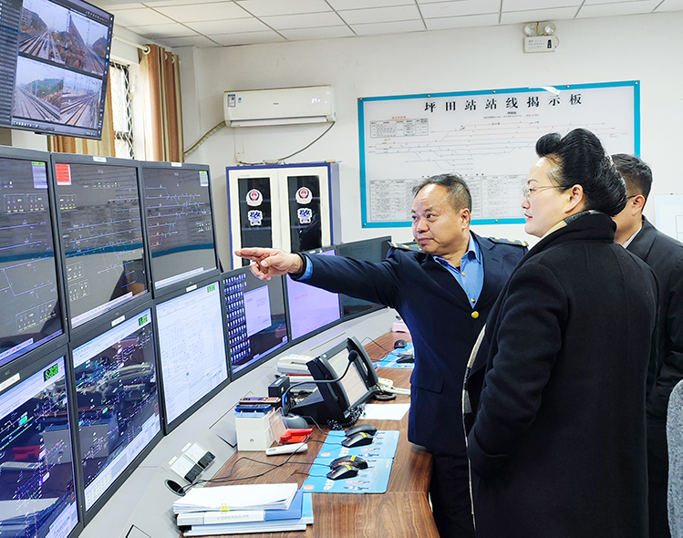 魏淑萍一行來到坪田站調(diào)度室,智慧物流園區(qū)綜合服務中心、高標準倉庫、冷鏈倉庫等重點區(qū)域,在詳細了解各項目建設(shè)進展、運營管理、規(guī)劃布局等情況后,對各項目推進取得的成果給予肯定,并提出明確要求。