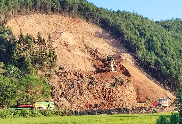 受損道路中三陽鄉(xiāng)X009甲山到更新K3+300路段上邊坡山體滑坡最為嚴重,滑坡量多達4萬多方,樹木泥石覆蓋全幅路面,導致道路雙向中斷100多米。當日交投建工專業(yè)技術人員在對山體滑坡進行勘察時,發(fā)現一處長達20多米,寬約100毫米的裂縫,隨時有再次塌方風險,經與平江縣應急救援指揮部請示和商議,迅速對其進行開挖臺階卸載處置,防止二次事故發(fā)生,可謂險情非常嚴峻,極大地影響了更新、萬古、甲山等8個村近2萬多村民的安全出行,物資輸送及災后救援也造成了阻隔,除險保暢救援行動刻不容緩……