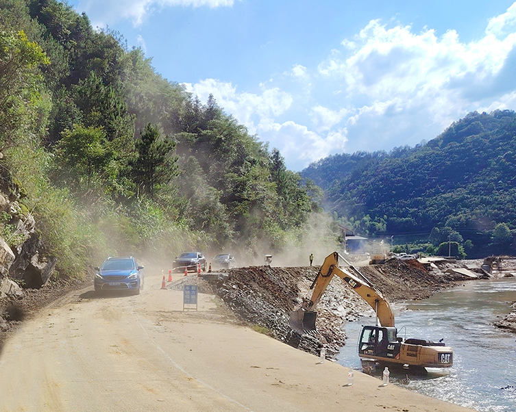 “搶時間、提速度,我們就是一顆顆鋪路石?!苯煌督üぶ饕撠熑私M織突擊人員和機械設備率先到達搶險現場,并迅速指揮機械設備日夜奮戰(zhàn),齊心協(xié)力清理路面上的落石和塌方。在現場我們看到,在狹窄的工作面上,數臺挖掘機爭分奪秒、振臂高揮,數臺裝載機轟鳴震耳、交替推進,突擊隊員們踩著雨水泥漿、揮汗清淤,搶險隊伍以“城運速度”,僅在3天的時間清理邊坡及整修路基塌方130余處,清理土石方約5萬余方,恢復了11條道路的通行。