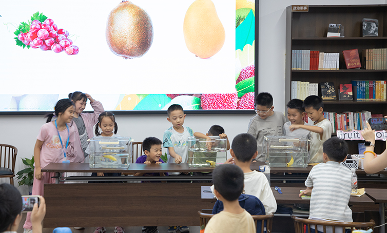 在課堂的最后老師帶領(lǐng)孩子們做了一個有趣的實驗,孩子們紛紛變成水果科學(xué)家,探索水果的奧秘。