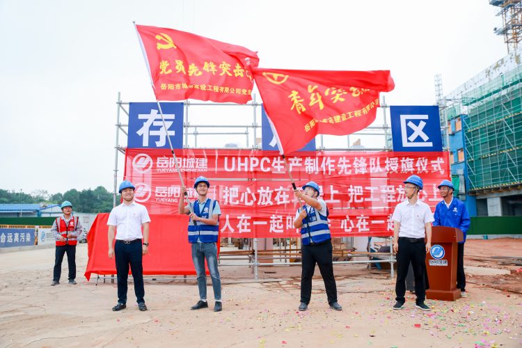 活動中,岳陽城建主要領導分別給中心醫(yī)院項目部黨員、青年突擊隊(生產(chǎn)制作先鋒)進行授旗,并為“UHPC屋架施工黨員示范區(qū)”揭牌。