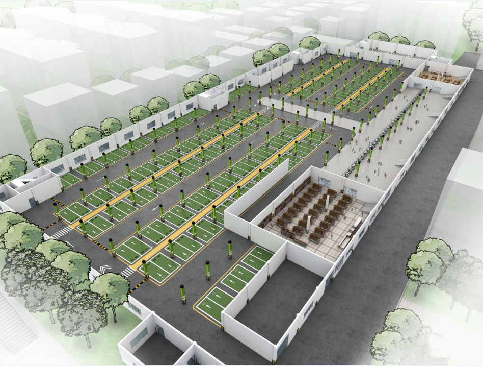 負(fù)一層為“地下智慧接送系統(tǒng)”的核心區(qū)域,設(shè)置停車區(qū)、人行通道、家長等候區(qū)、學(xué)生集散區(qū),使學(xué)生接送整個過程都在地下空間安全、有序進(jìn)行,對于地面交通的影響降到了最低,學(xué)校門前區(qū)完全實現(xiàn)人車分流,僅需對非機(jī)動車和行人二者進(jìn)行交通分離組織。