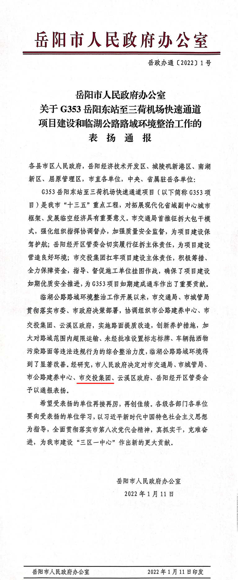 關(guān)于G353岳陽東站至三荷機場快速通道項目建設(shè)和臨湖公路路域環(huán)境整治工作的表揚通報