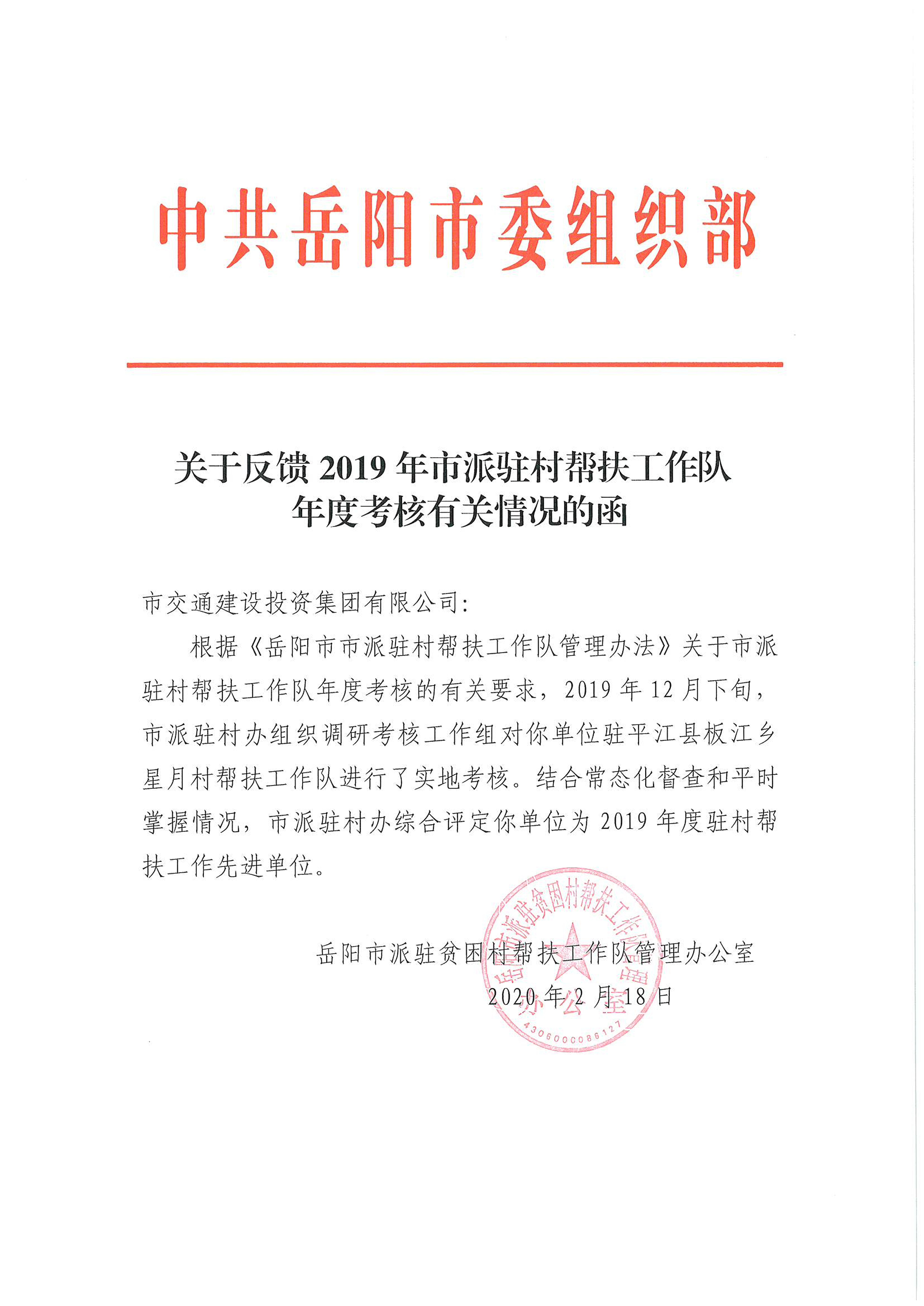 關(guān)于反饋2019年市派駐村幫扶工作隊(duì)年度考核有關(guān)情況的函