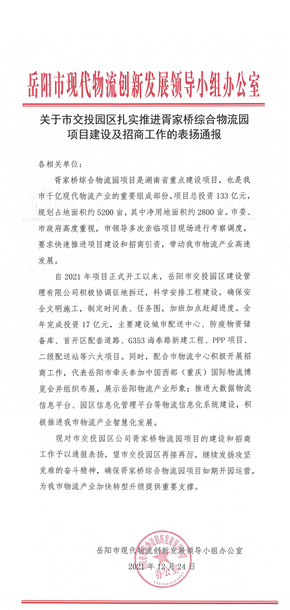 關(guān)于市交投園區(qū)扎實(shí)推進(jìn)胥家橋綜合物流園項(xiàng)目建設(shè)及招商工作的表?yè)P(yáng)通報(bào)