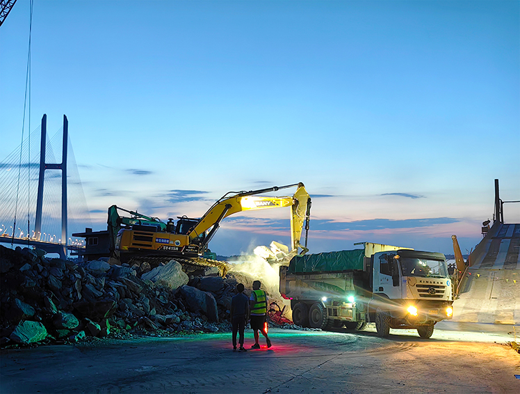 助合龍 接支援華容團州決堤指令后,迅速組織參建單位200余人組成黨員突擊隊、青年突擊隊,24小時分組輪班駐守一線,指揮調(diào)度塊石運輸工作。經(jīng)過三天三夜奮戰(zhàn),通過水運和陸運方式,實現(xiàn)塊石料車輛轉(zhuǎn)運600余臺次,碼頭船舶運輸23艘次,自卸載重貨車直運華容180車次,提供挖機10臺,吊船1臺,共計運輸石塊料約26000噸,有力保障決堤順利合龍。