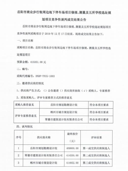 岳陽市商業(yè)步行街周邊地下停車場項目修規(guī)、測量及五所學校選址規(guī)劃項目競爭性談判成交結果公告
