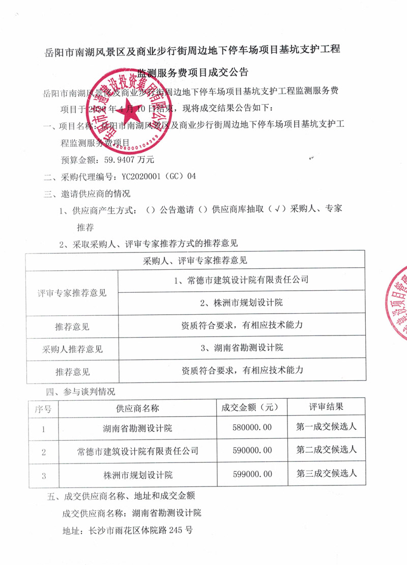 岳陽市南湖風(fēng)景區(qū)及商業(yè)步行街周邊地下停車場項目基坑支護工程監(jiān)測服務(wù)費項目成交公告