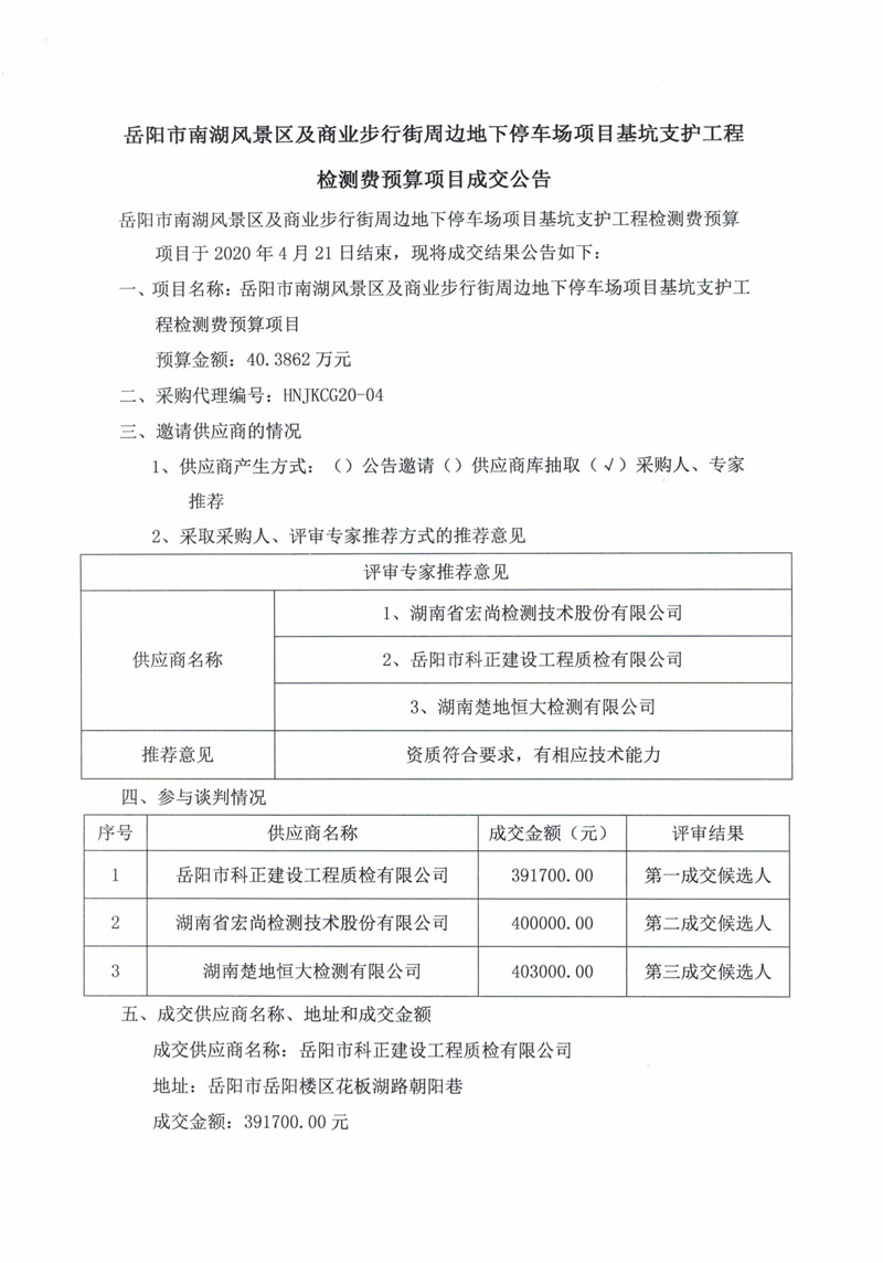 岳陽(yáng)市南湖風(fēng)景區(qū)及商業(yè)步行街周邊地下停車場(chǎng)項(xiàng)目基坑支護(hù)工程檢測(cè)費(fèi)預(yù)算項(xiàng)目成交公告