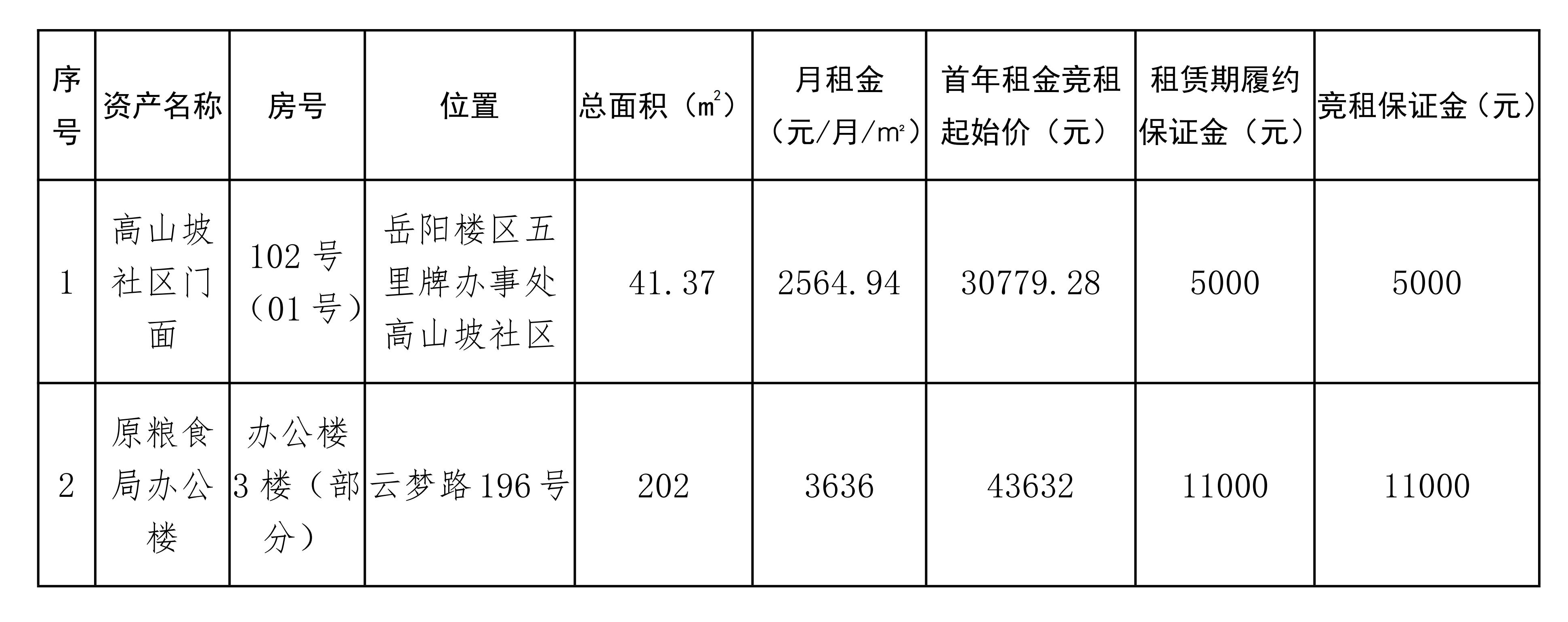 岳陽市交投資產(chǎn)運營管理有限公司對五里牌辦事處高山坡社區(qū)門面、糧食局辦公樓進行公開招租,定于2025年4月28日上午十時在岳陽市交投資產(chǎn)運營管理有限公司通過現(xiàn)場競租的方式對以下資產(chǎn)進行公開招租?,F(xiàn)公告如下: